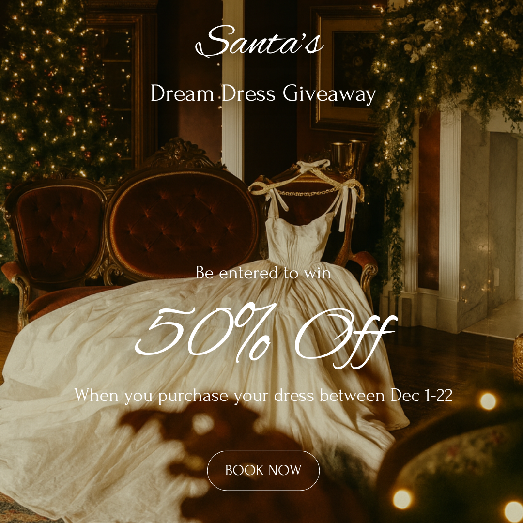 Whether you’re envisioning romantic lace, modern simplicity, or a sparkling showstopper, this is your moment. Every bride who purchases her gown during the giveaway period is automatically entered to win. One winner will be selected to receive half off her wedding dress—courtesy of Santa himself.